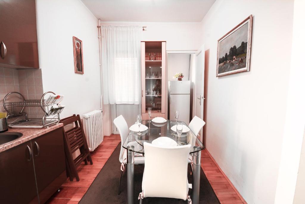 frižider, mikrotalasna rerna, mašina za pranje veša, kuhinja, električno kuvalo, posuđe, rerna, ploča za kuvanje, sredstva za čišćenje, sto za ručavanje, čaše za vino