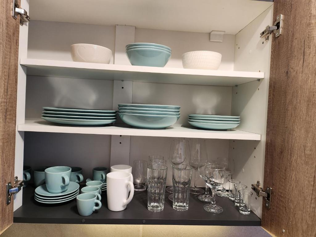 čajna kuhinja, frižider, mikrotalasna rerna, kuhinja, električno kuvalo, posuđe, ploča za kuvanje, toster, sredstva za čišćenje, aparat za kafu, čaše za vino