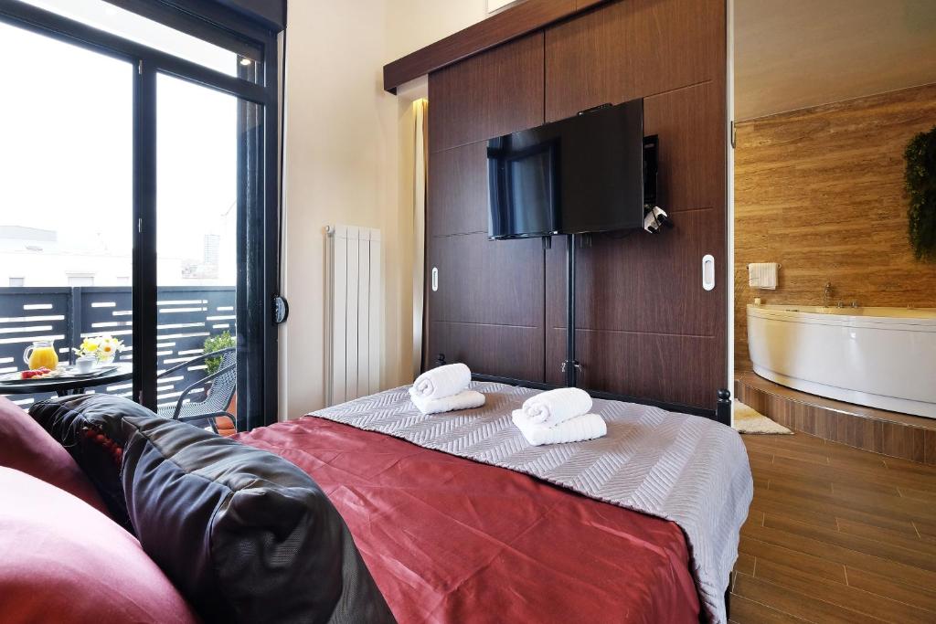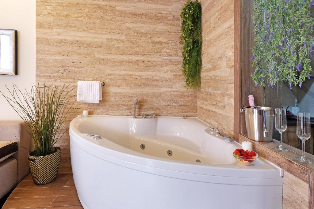 The hot tub and spa bath are the special features of this apartment. Boasting a private entrance, this air-conditioned apartment comes with 1 living room, 1 separate bedroom and 1 bathroom with a walk-in shower and a hairdryer. The well-fitted kitchen has a stovetop, a refrigerator, a dishwasher and kitchenware. Featuring a terrace with city views, this apartment also features a washing machine and a flat-screen TV with cable channels. The unit has 2 beds.