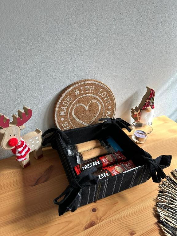 aparat za kafu/čaj, flaša vode, čokolada ili keks