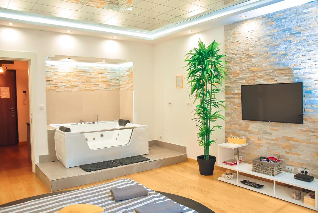 This apartment features a hot tub. The air-conditioned apartment features 1 bedroom and 1 bathroom with a bath and a hairdryer. The apartment's kitchenette, which has a refrigerator, is available for cooking and storing food. Featuring a balcony with garden views, this apartment also provides a minibar and a flat-screen TV. The unit offers 2 beds.