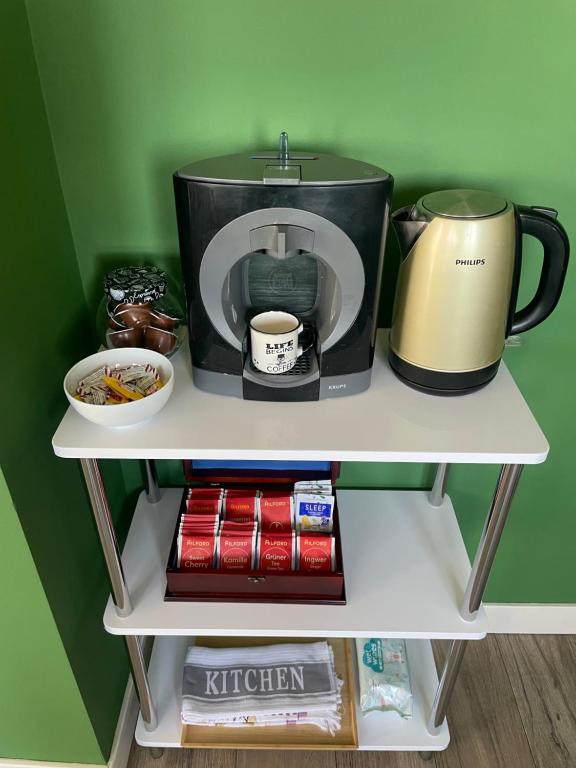 aparat za kafu/čaj, flaša vode, čokolada ili keks