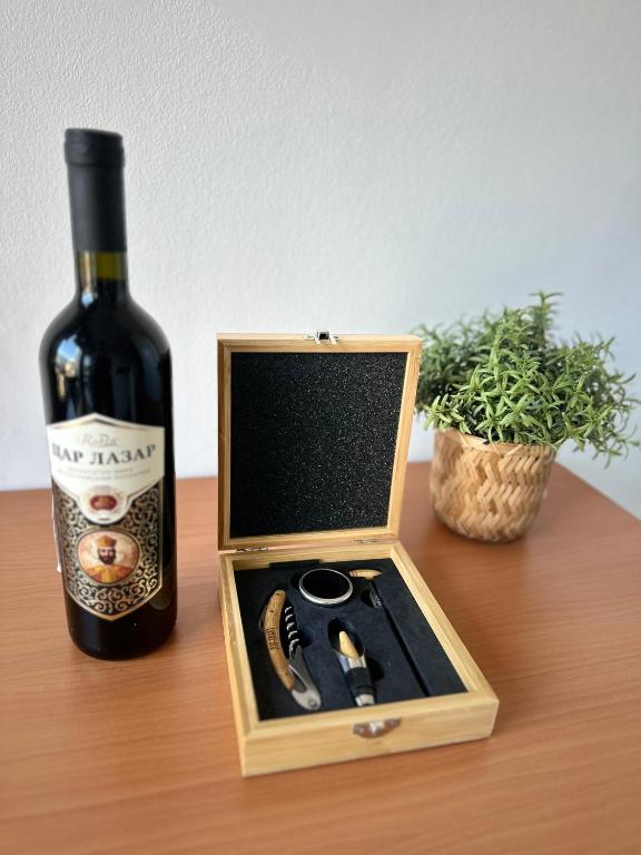 aparat za kafu/čaj, vino ili šampanjac, flaša vode, čokolada ili keks